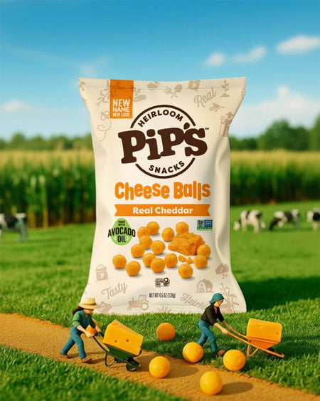 Irresistibly cheesy and perfectly crunchy! Baked with real Cheddar, Heirloom Corn, and Avocado Oil. At Pip's, heirloom isn’t just an ingredient — it’s our philosophy. Like all cherished heirlooms, our seeds are passed down through generations and nurtured by family farmers to deliver rich flavor and irresistible crunch in every bite. Made with real, non-GMO ingredients, Pip's Cheddar Cheese Balls are a delicious reminder that the best things are meant to be shared. Heirloom makes us different. Heirloom makes it better.
